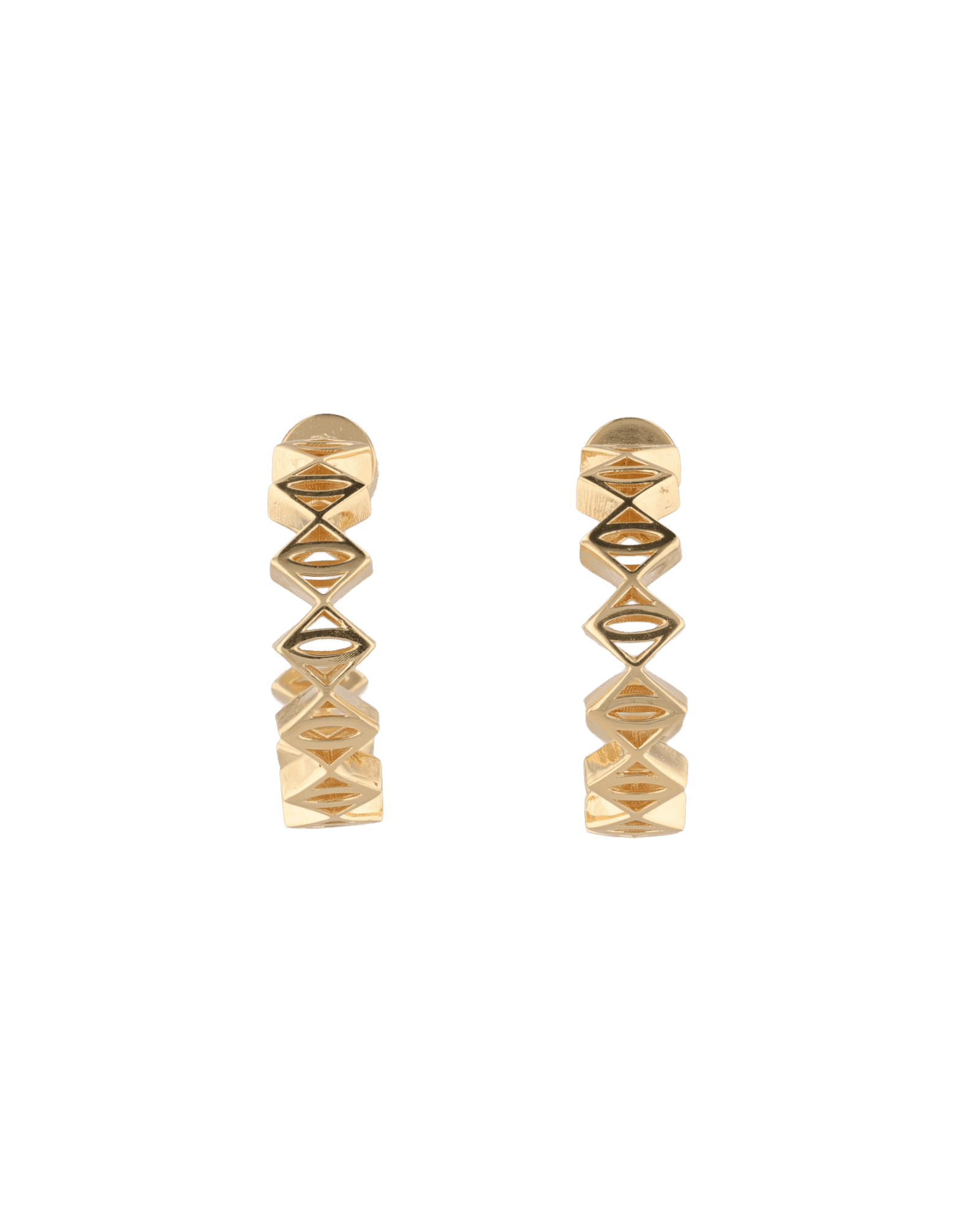 Stacked rhombus prisms step around the curve to form a sculptural open hoop. Polished finish, crisp lines, a modern lift on gold hoop earrings.