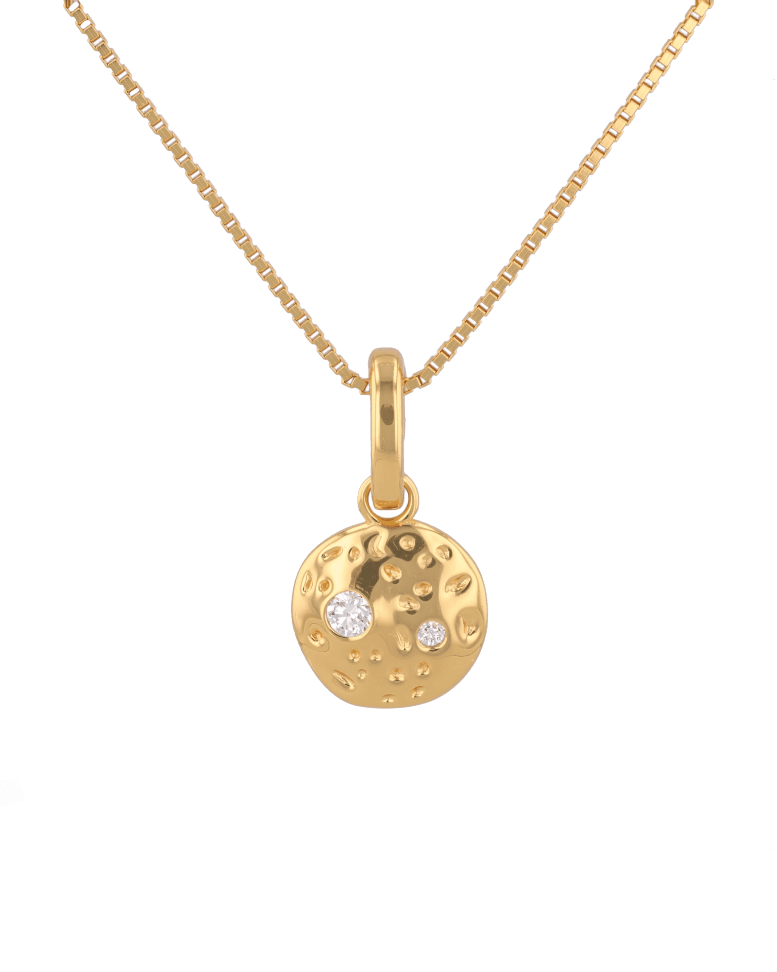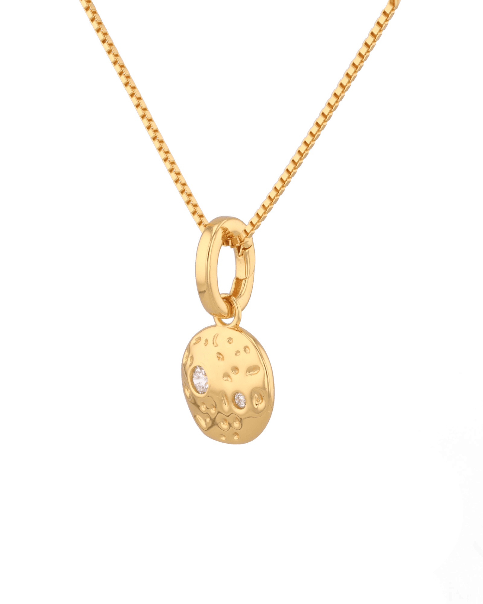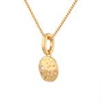 A little cosmos for every day. The Cosmo Diamond Disc Pendant glows in 18k gold vermeil, its softly cratered surface dotted with two brilliant lab grown diamonds. The refined silhouette adds subtle sparkle from coffee run to cocktails. Clip it to a paperclip chain for contrast or slide it onto a fine rolo for a clean finish. Crafted from sterling silver and sealed with a premium protective E coating. Comes with an oval openable clasp bail, allowing easy attachment to any links.