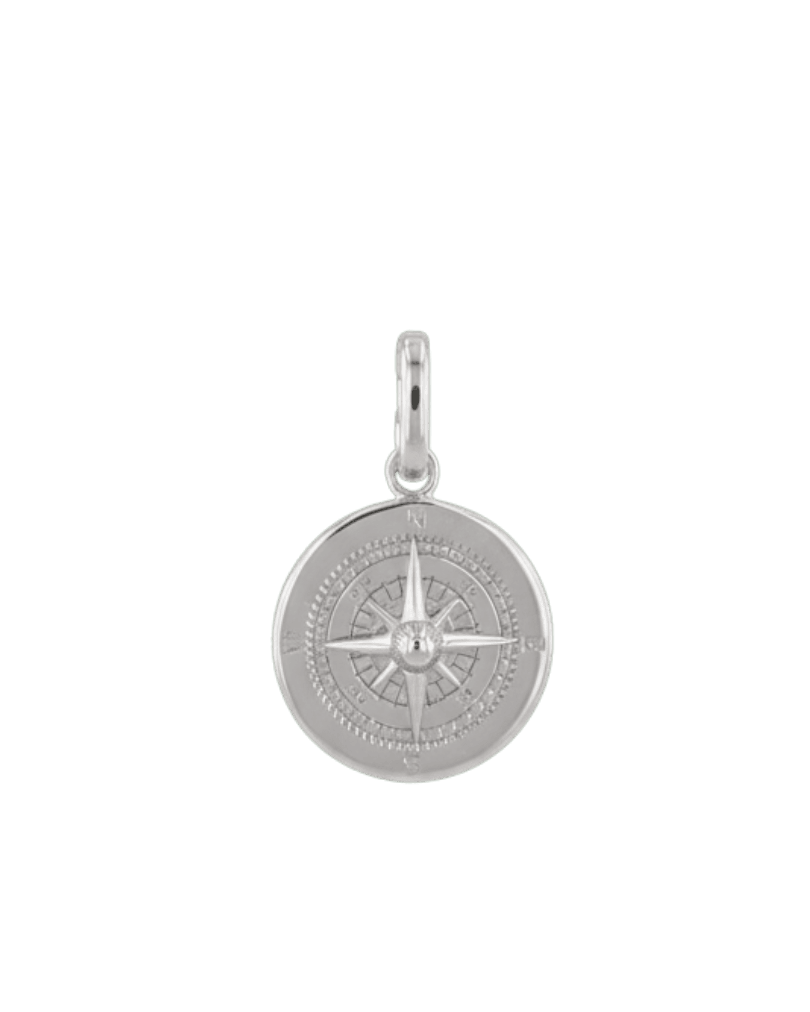 The Journey Compass Pendant in rhodium plated sterling silver delivers crisp definition and a sleek cool tone. Its map inspired lines and raised centre bring depth without stones, creating a clean talisman that suits everyday wear. Lightweight yet substantial, it plays well with paperclip and cable chains and adds subtle direction to any look. Comes with an oval openable clasp bail, allowing easy attachment to any links.