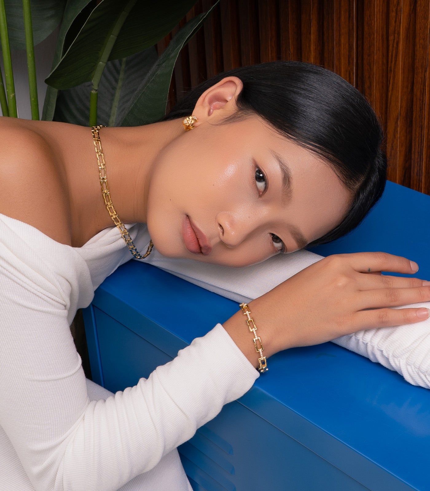Our pieces are crafted from 18K gold-plated sterling silver, PVD-coated stainless steel and lustrous finishes, offering maximum impact.