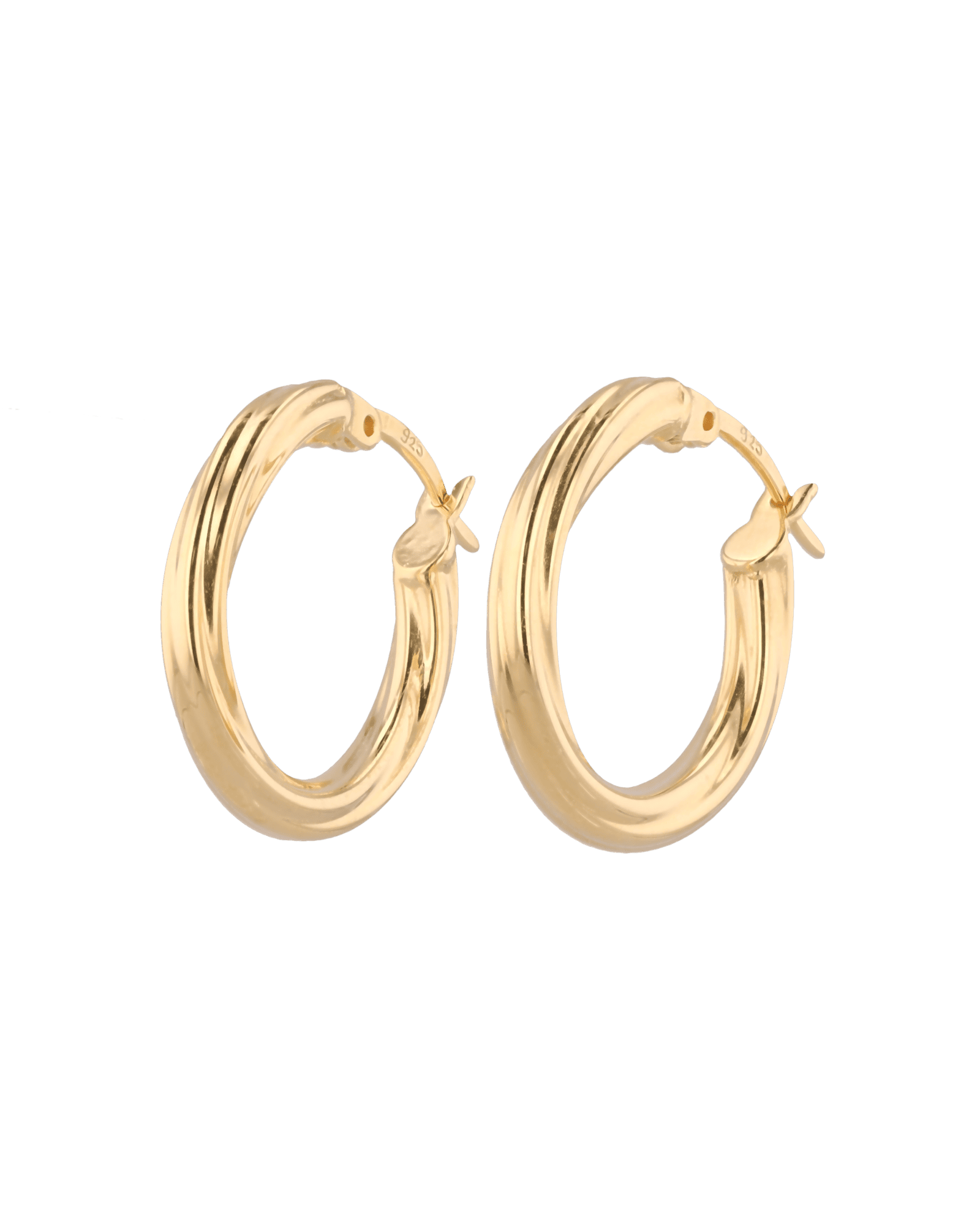 A wide round hoop set with light textured grooves that catch the light. Clean silhouette, warm gloss, and an easy upgrade for gold hoop earrings.